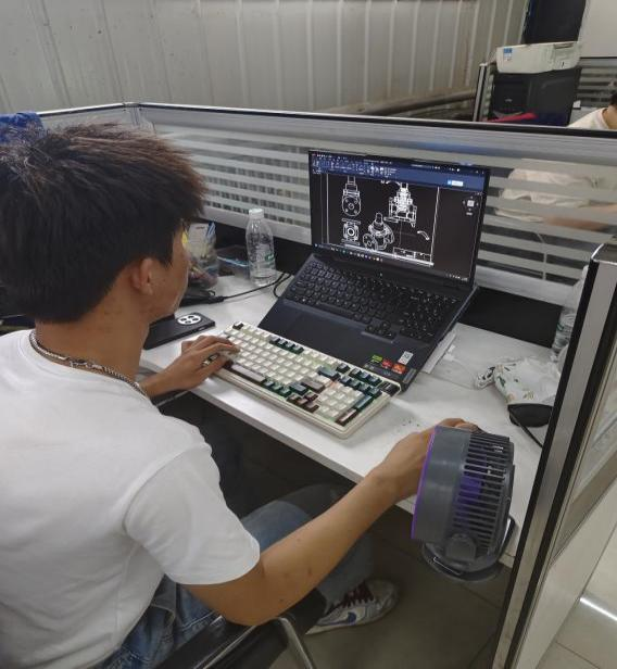面对复杂的零件图纸与严苛的设计规范,油鸿旭展现出攻坚克难的韧性。每一张待转化的草图、每一份需要精确标注的工程图,都成为他必须“拆解”的难题。他对着电脑屏幕,如同匠人审视作品,反复研究零件的参数与工艺要求,在二维的方寸之间,探寻尺寸、公差与技术要求的最优表达。当遇到图纸表达的瓶颈或软件操作的疑难时,油鸿旭求知若渴的本性便显露无遗。