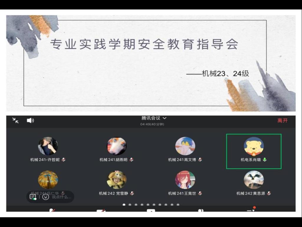 为提高学生的安全意识和自我保护能力,7月21日,辅导员老师肖璐通过腾讯会议形式,组织召开专业实践学期安全教育指导会。会议由辅导员肖璐老师主持,机械23、24级全体人员参加。