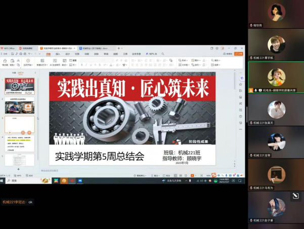 为全面总结学习成果与实践情况,及时发现并解决实践过程中出现的问题,进一步提升学生的专业实践能力。7月27日机械221班依托线上会议形式召开专业实践学期第五周总结会,本次会议由指导教师顾晓宇主持,共34人参会。