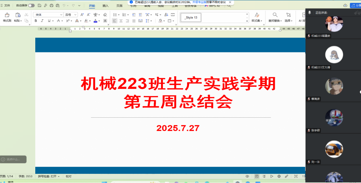 7月27日机械223班的同学们圆满完成了生产实践学期第五周生产实习,为总结这一周的学习工作情况,查找生产实习过程中的不足,生产实习指导教师李玲老师通过腾讯会议组织召开机械223班第五周生产实习总结会。