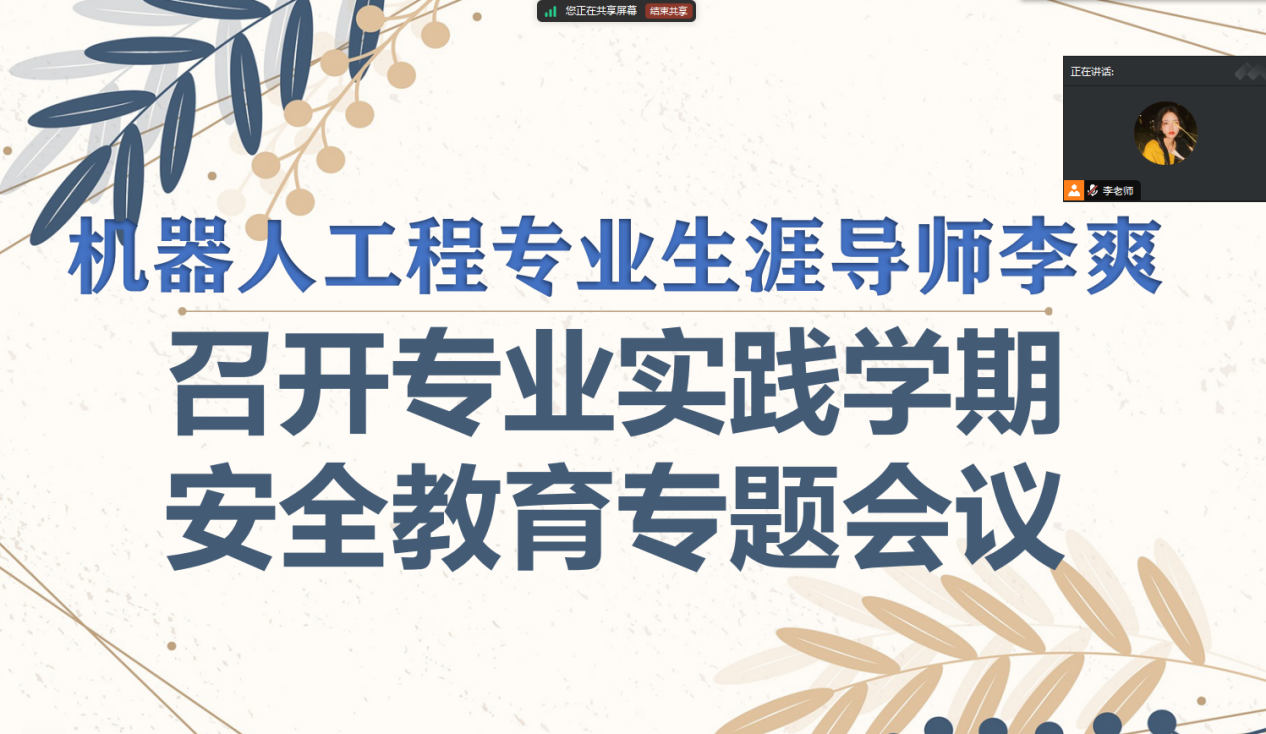 为切实保障机器人工程专业学生在专业实践学期的实习安全,引导在外实习学生增强安全防护意识,近日,机器人工程专业生涯导师李爽通过腾讯会议平台,面向在外实习学生召开安全教育专题会议,围绕实习全流程安全要点进行细致讲解与重点强调。