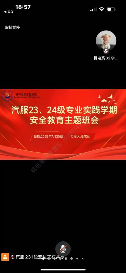 为强化学生实践学期安全意识,筑牢安全防线,7月30日,汽服专业23、24级以线上形式召开专业实践学期安全教育主题班会,由李雪东老师主持,汽服23、24级学生积极参与。