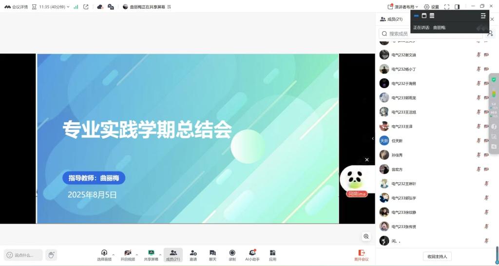 8月5日,曲丽梅老师主持的专业实践学期总结会在腾讯会议中开展。本次总结会旨在回顾过去一学期中,学生们在专业实践中的成长与收获,同时为未来的教学实践提供宝贵的经验和借鉴。