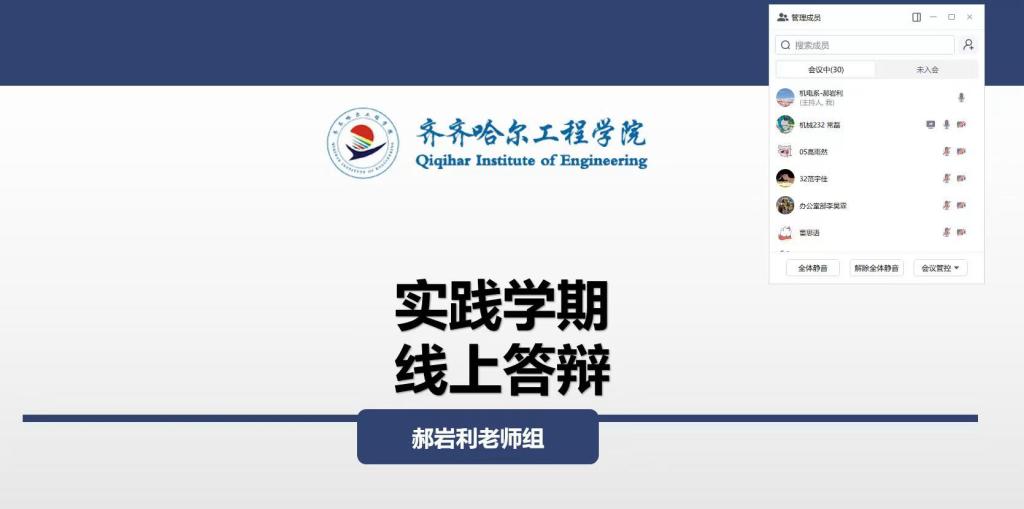 为检验学生实践学期工作情况,机械专业郝岩利老师于8月4日通过腾讯会议组织召开了实践学期线上答辩会议。此次会议围绕实践学期答辩相关内容展开,会议由孙瑀泽主持,机械232班全体学生参会。