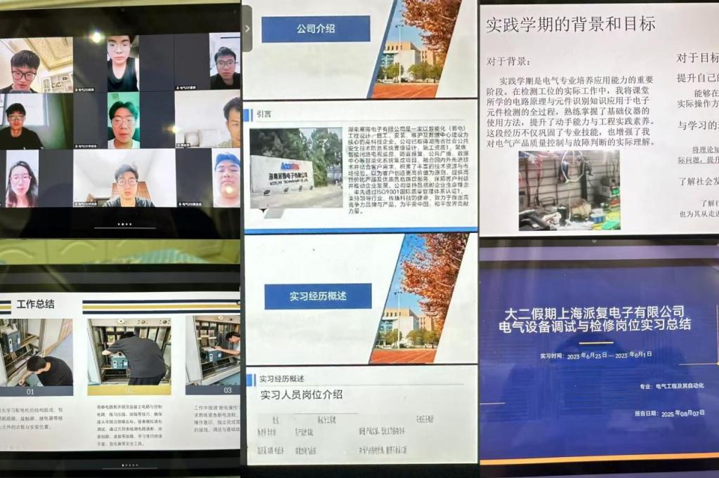 本次会议潘老师先对答辩要求进行讲解,接下来由各组进行答辩,汇报本次专业实践学期情况。其中,电气231班李雨默组进行答辩,他们组学习配电柜结构组成、观察电路图并规范连接主电路与控制电路,练习压线、固线等技巧,强调断电操作原则,并且他们小组已经掌握了基础电工操作,深刻理解安全第一的重要性,牢记操作规程。接下来是电气232班齐洪渤组进行答辩,主要分为设备安装与接线、设备调试与运行、日常巡检与维护、故障诊断与排除等方面。紧接着由电气231班黄炫茜组进行答辩,首先介绍了成员的岗位分配,在实习单位的工作内容。分别为理论培训、设备操作、质量控制等。潘帝池老师对各个小组提出了相应的问题,各位同学根据问题依次答辩。