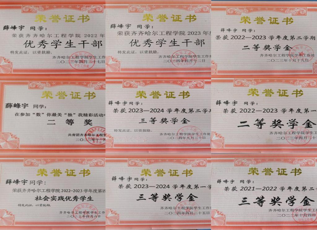 在担任班级生涯委员的职责期间,薛峰宇展现出了非凡的组织能力和责任感。他细心地管理班级各项事务,包括但不限于收集同学们的意见和需求,并及时有效地协调资源,确保大家能够共同进步。他凭借这份责任心,赢得了同学们的广泛信任,也因此在学院中建立了良好的口碑。成绩方面,薛峰宇的表现同样令人瞩目。在电气专业的激烈竞争中,他的专业成绩常年保持在年级前10%的水平,连续四年荣获学校颁发的奖学金。通过将理论知识与实践相结合,他还成功申请到了国家励志奖学金,这不仅是对他学习成果的认可,也是对他综合素质的肯定。