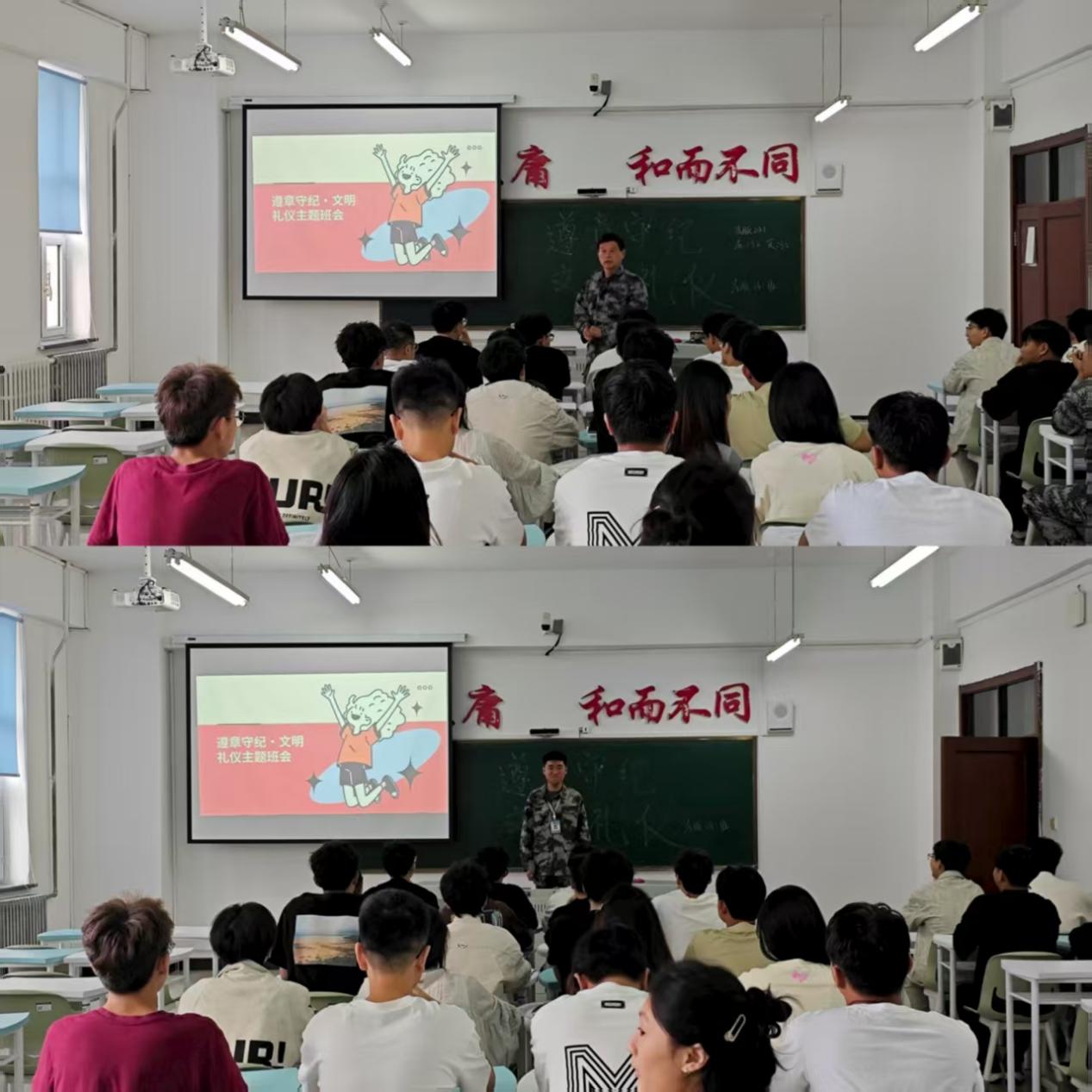班会上,李峰松首先结合校园生活中的真实案例展开讲解,既有课堂迟到、课间喧哗、随手丢弃垃圾等不文明现象,也有主动帮助同学、自觉维护公共秩序的正面事例。通过正反对比,同学们直观地感受到遵章守纪与文明礼仪对个人成长和集体氛围的重要性,深刻理解了“无规矩不成方圆”的道理,也开始反思自身在日常行为中的不足。随后,辅导员董晓亮要求学生们要从自身做起,从点滴细节做起:课堂上专注听讲,不扰乱秩序;校园里爱护环境,不随意破坏;与人交往时使用文明语言,友善待人,努力成为遵章守纪、文明有礼的中学生。