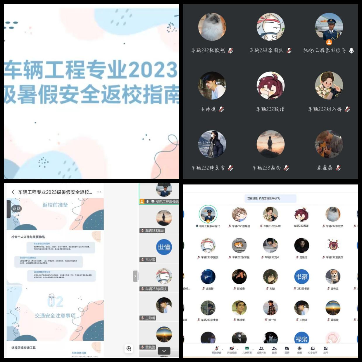 为确保学生顺利、安全地返回校园,车辆工程专业辅导员徐飞老师于8月25日组织召开2023级暑假安全返校线上会议。会议围绕返校前准备、交通安全、健康防护、宿舍安全、财务与信息安全及到校后事项六大方面展开,为学生提供了详尽的返校指南。