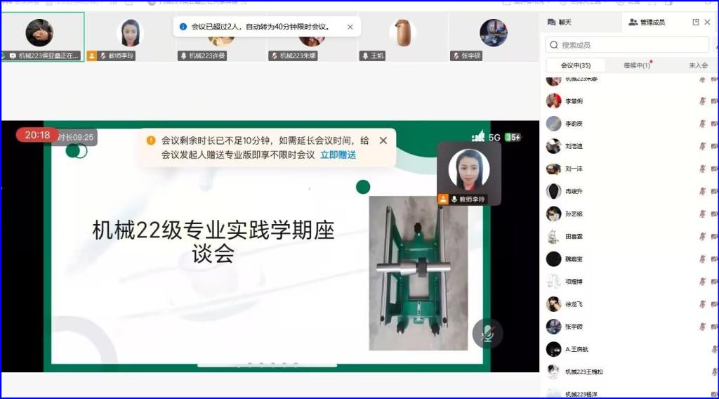 7月2日机械专业李玲老师通过腾讯会议召开了机械22级专业实践学期座谈会,机械22级全体同学参加,总结近期专业实践学期收获与不足,明确后续专业实践目标及内容。