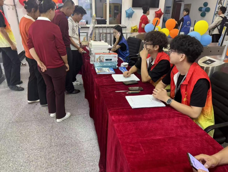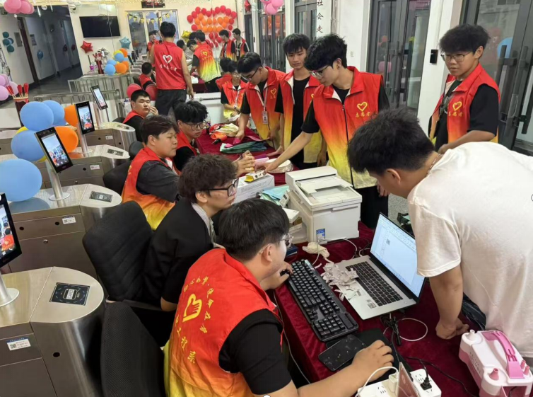 迎新现场,五公寓社区管理委员会的宿管们身着红黄色渐变的志愿者马甲,在装点着彩色气球的报到点穿梭忙碌。他们熟练操作着电脑、打印机等设备,快速为新生办理入学手续,还耐心回应新生们关于校园生活的各类疑问,以热情高效的服务,助力新生顺利开启大学之旅,现场处处洋溢着青春活力与温暖气息。