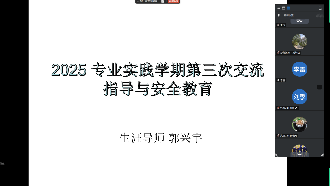 伴随着专业实践学期来到了第三周,为更好的了解前两周工作情况与安全情况,为更好的完成专业实践学期接下来的各项工作,在7月6日下午,生涯导师郭兴宇利用腾讯会议组织新能源专业、汽服专业同学召开了专业实践学期第三周交流指导与安全教育。
