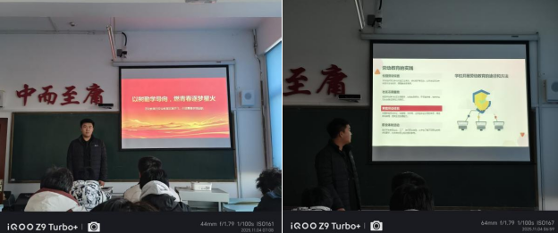 宣讲会上,王洪岩首先聚焦于“劳动教育重要性”这一话题,阐释了劳动教育对于个人品格塑造和增强社会认同感的重要性,并进一步通过列举劳动实践方法、案例及成果说明。随后,王洪岩将话题转向“安全教育”。结合日常生活与学习中的实际场景,他深入浅出地阐述了安全的重要性。列举了生活中交通、消防、食品、网络安全及我校寝室安全等五个方面内容,警示在场同学,麻痹大意是最大的隐患,必须将安全知识化为自觉行动,共同构筑校园安全的坚固防线。
