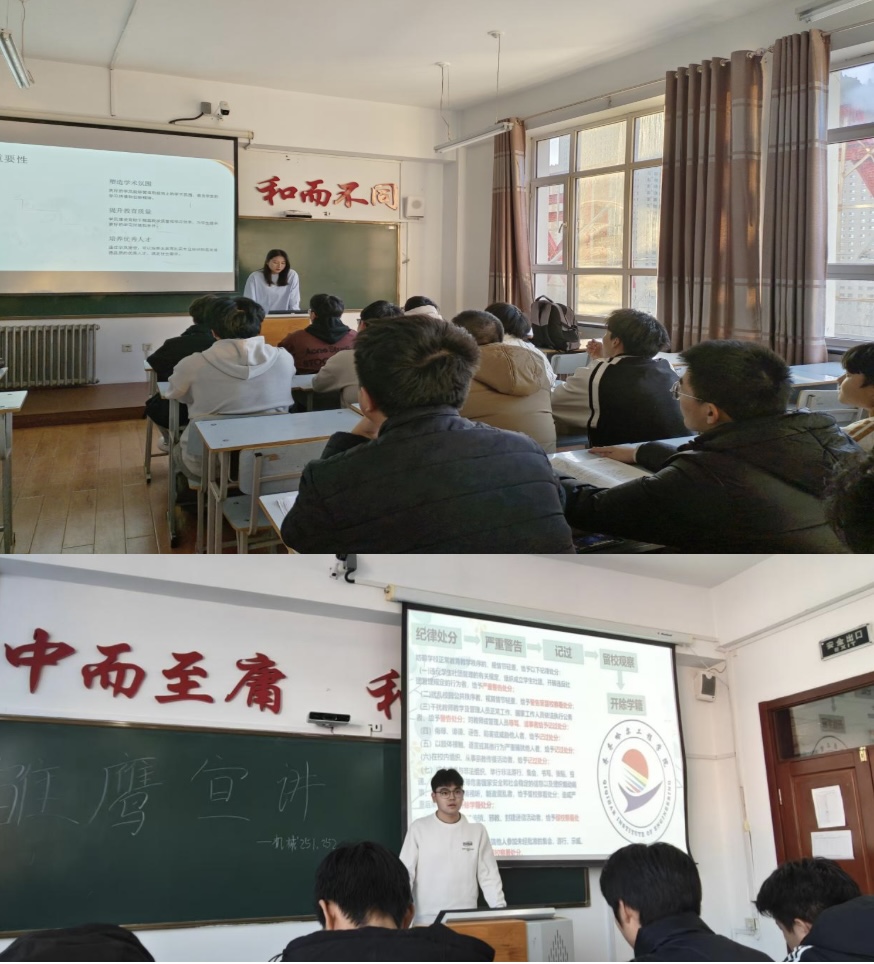 在校园制度宣讲环节,学生辅导员户国朝详细介绍了学校“四无校园”的建设要求、校训“中而至庸 和而不同”所蕴含的精神,以及校园准则、纪律处分规定和寝室管理规范等内容。他们结合实际案例,通俗地讲解了各项制度的具体要求,让新生们对校园规则有了清晰认知,明白要在遵守制度的前提下开展学习和生活。学风建设专题教育中,通过学生辅导员支兴雯的经验分享,新生们深刻认识到学风是大学的灵魂,是逐梦的基石。学校以“严谨、诚信、进取”为核心的学风,体现在课堂专注、考场坦荡,更在实践探索、竞争互助中彰显。学校通过学习方法指导、学术竞赛与活动等多种途径建设优良学风,还定期举办学术讲座和研讨会,营造浓厚学术氛围,助力学生自主学习能力和创新实践能力提升。