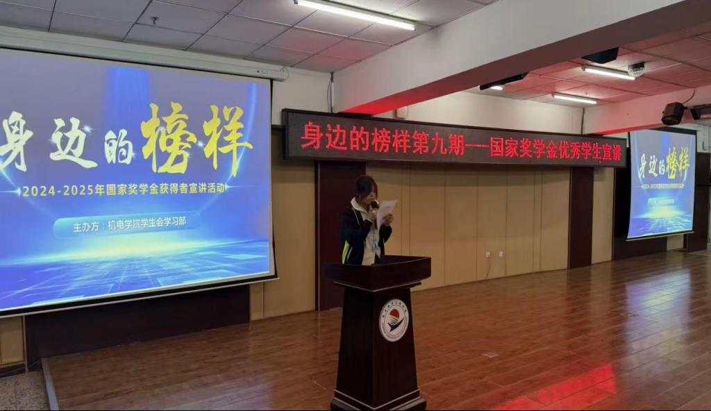 11月13日18:00由机电学院学生会学习部主办的身边的榜样第九期国家奖学金优秀学生宣讲活动在图书馆501举行。此活动由新能源251袁艺丹主持,机器人221徐铭含,电气223陈尚以及汽服231尹思文三位获奖学生进行宣讲。