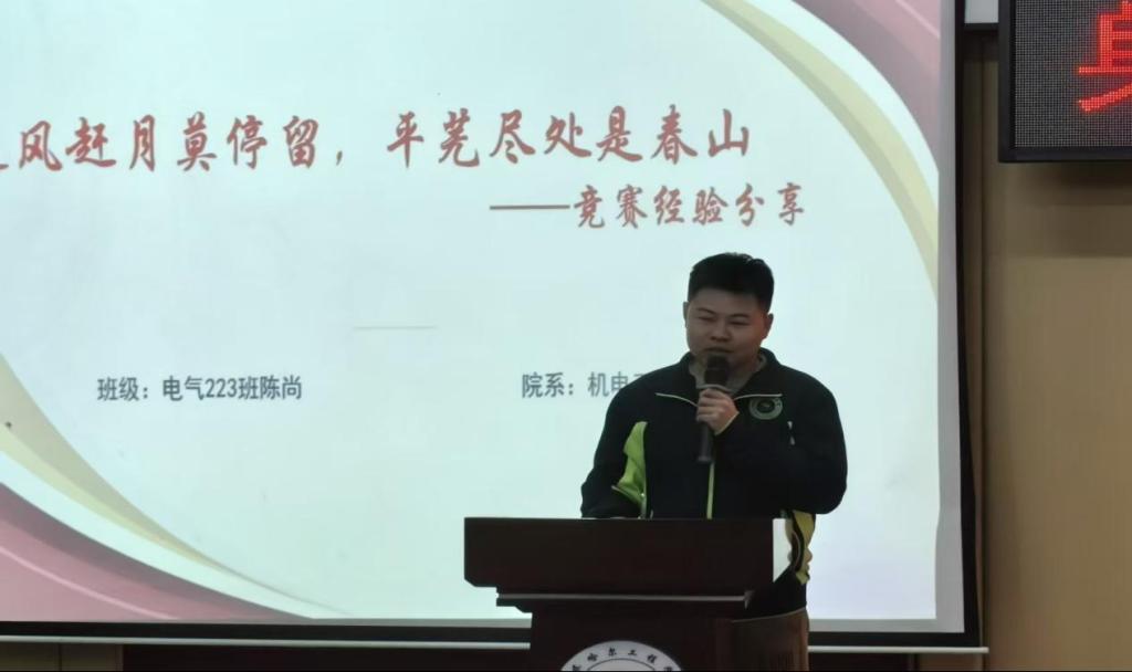 其次,电气223陈尚以竞赛经验为核心进行宣讲,分享赛事实践与技术应用心得,总结竞赛带来的成长。他的宣讲为学子树立了竞赛赋能成长的榜样,激发了大家参与学科竞赛、锤炼专业技能的热情,传递了敢创新、勇试错的进取精神。