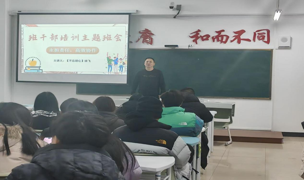 针对“如何做好班干部”这一核心问题,徐飞老师结合实际场景给出具体方法。他强调,学习是班干部的第一要务,需提前规划时间,平衡好工作与学习的关系;要先提升自我,在学习和生活中做到自律自强,以“服众”的榜样魅力赢得同学认可;更要主动学习工作方法,心怀班集体、注重团结合作,通过差异化沟通化解矛盾,确保班级事务高效推进。此外,徐飞老师还详细拆解了班长、学习委员、生活委员、课代表、团支书等岗位的具体职责,让每位班干部清晰知晓自身任务,同时明确列出“杜绝懒惰敷衍、避免马虎浮躁、摒弃不自律”等禁忌行为,为班干部履职划定“红线”。 培训尾声,徐飞老师鼓励全体班干部以责任感为帆,以实干为桨,携手打造有活力、有温度的班集体。