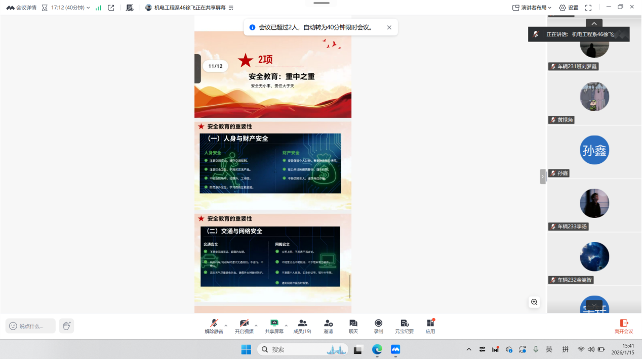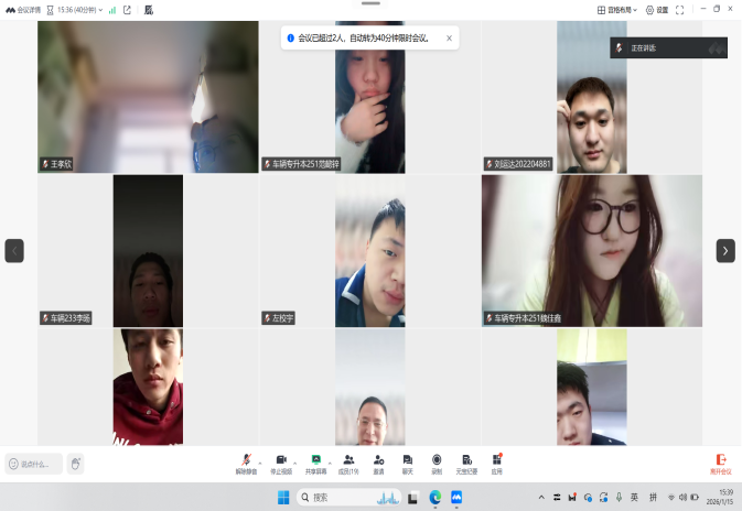 1月15日,徐飞老师在腾讯会议上召开社会实践学期第二次阶段总结汇报会。本次会议聚焦学生实践任务完成情况、工作成效与创新点,深入剖析现存问题并明确整改方向,同时开展专题安全教育,为 20 名同学筑牢实践根基,护航成长之路。
