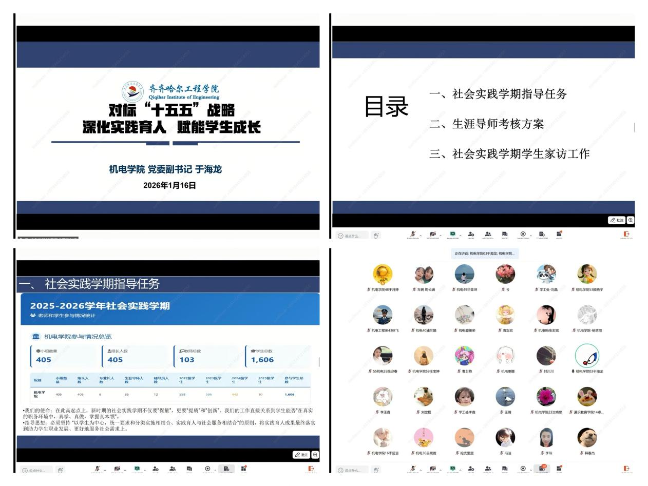 为明确社会实践学期的工作方向保障实践育人质量,助力高素质应用型人才培养。1月16日机电学院党委副书记于海龙老师以腾讯会议的形式召开了以对标“十五五”战略深化实践育人赋能学生成长为主题的社会实践学期指导会,本次会议由机电学院党委副书记于海龙老师主持,机电学院全体生涯导师与辅导员参会。本学期共组建405个实践小组开展多元化实践活动。
