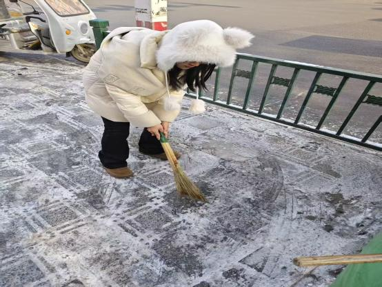 充分发扬不怕苦、不怕累的精神,拿着工具奋力铲冰清雪,虽然手和脸冻的通红,但这并没有影响扫雪除冰的热情和工作效率,冲在前、干在先、战严寒、斗冰雪,分工有序,干得热火朝天,道路上演奏着“咣咣咔咔嚓嚓”的扫雪除冰。