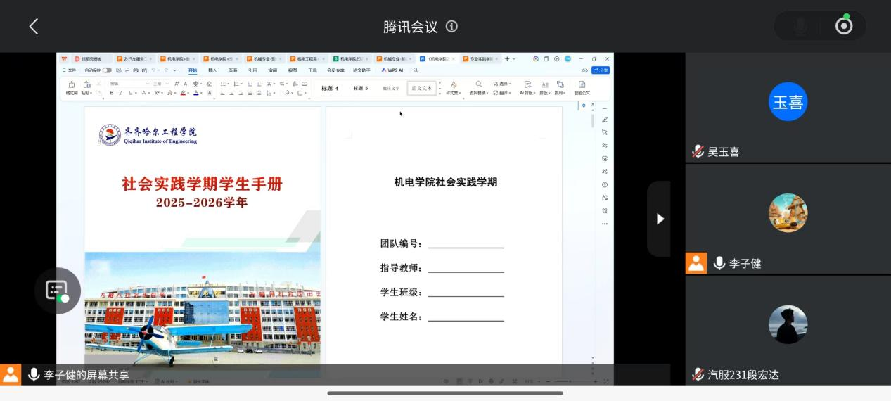 指导会上,李子健老师首先特别强调了各项目的考核标准与材料提交要求,提醒同学们注重过程记录、留存实践证据,并鼓励大家在实践中勇于创新、展现担当。其次,通过结合齐齐哈尔工程学院《社会实践学期学生手册》要求,指导成员优先完成青春FUN肆拍、志愿服务记录等核心项目。通过本次指导会,不仅对实践任务有了清晰认知,更激发了参与实践的热情与信心。