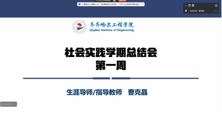 为深化教育教学改革,检验第四学期社会实践成效,搭建成果交流与经验分享平台,1月12日齐齐哈尔工程学院机电学院指导老师曹克晶通过线上腾讯会议形式,主持召开第四学期社会实践汇报会。各实践小组组长展示实践成果,分享成长感悟,整场汇报会流程规范、内容充实,彰显了学子们“在实践中受教育、长才干、做贡献”的青春风采。