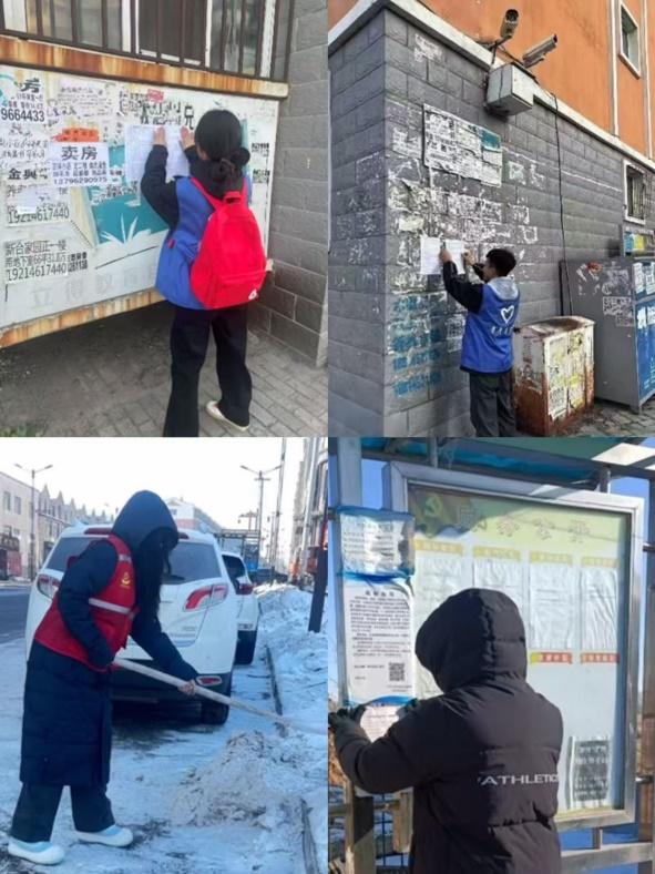 这四名同学提前准备好 “注意路面结冰 小心滑倒”“低温天气 谨防冻伤” 等温馨警示标语,在社区单元门口、台阶两侧、等重点位置逐一粘贴。他们还向过往居民耐心讲解防滑技巧与防冻伤常识,特别提醒老人和儿童尽量减少外出,外出时做好保暖防护。