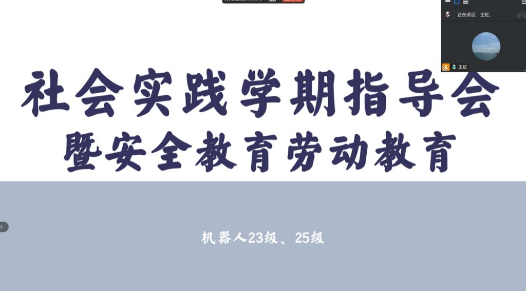 为推动社会实践学期各项任务落地见效,进一步强化学生安全防护意识与劳动实践能力,1月17日,辅导员王虹通过线上会议平台召开专题指导会,机器人23级、25级全体学生及生涯指导老师参会。