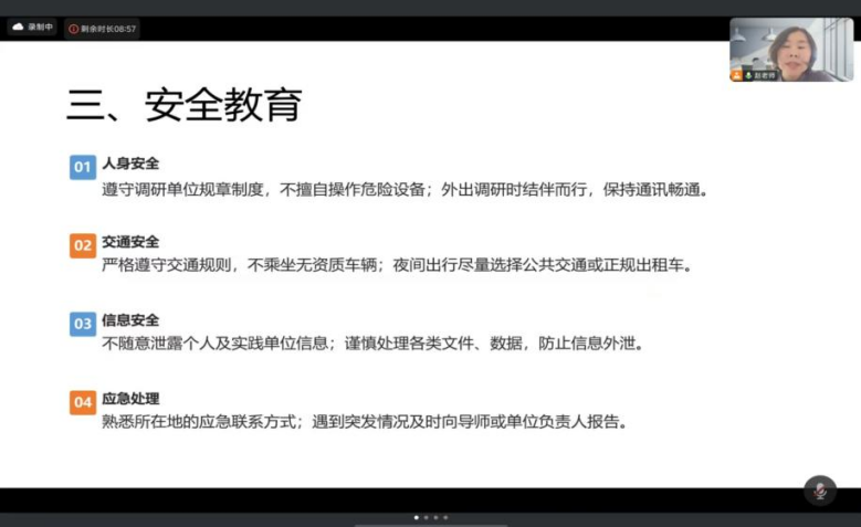 随后进入安全教育环节,赵丹丹从人身、信息、网络安全及出行安全等方面重点强调,提醒同学们外出实践需报备行程、防范风险,保护个人信息与健康,讲解突发情况应急处置方法,要求及时与老师沟通。