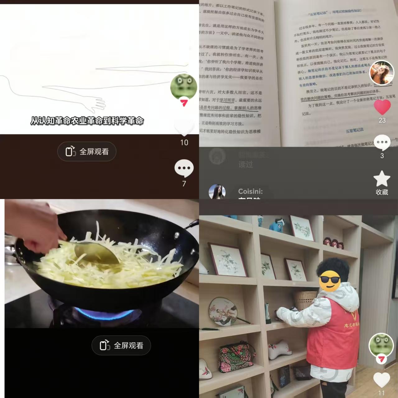 小组成员们的参赛作品风格多元、内容鲜活,既有以《人类简史》为蓝本,用动画梳理从认知革命到科学革命演进脉络的知识科普视频,也有分享“五星笔记法”等高效学习技巧的读书感悟;既有记录铁锅炒土豆丝全过程、充满烟火气的美食创作,也有身穿红马甲,整理公益书架的温暖志愿服务瞬间。