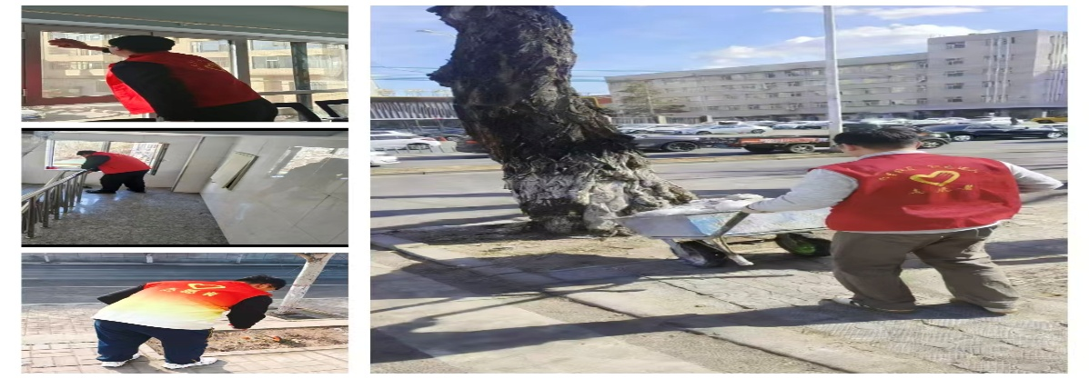 活动中,包亚鹏在内蒙古包头市昆都仑区的街边区域,用工具仔细清理杂物与烟头;龙泽宇在内蒙古通辽市鲁北镇农场立新分场的社区主干道旁,用手推车清运路边残留的冰雪;郭笑则在社区活动中心内,认真擦拭公共区域的窗户玻璃,为居民营造明亮整洁的活动空间;张瑞通在内蒙古通辽市奈曼旗的社区,手持扫帚清扫。成员们分工协作,覆盖了户外清扫与室内保洁等多个场景,不放过任何一处卫生盲区,以实际行动为家乡营造整洁舒适的居住环境。