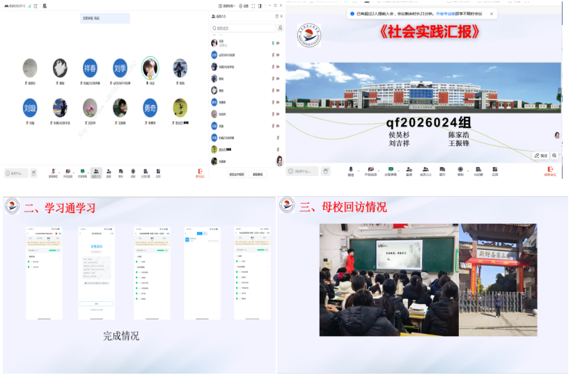 为深化实践育人成效,复盘阶段工作亮点与短板,锚定下一阶段实践方向,2026 年2月2日,生涯导师冯洁组织本学期第四次线上会议,指导社会实践,qf2026010组、2026024 组、2026028组三支实践队伍全员集结,共话实践收获与成长。