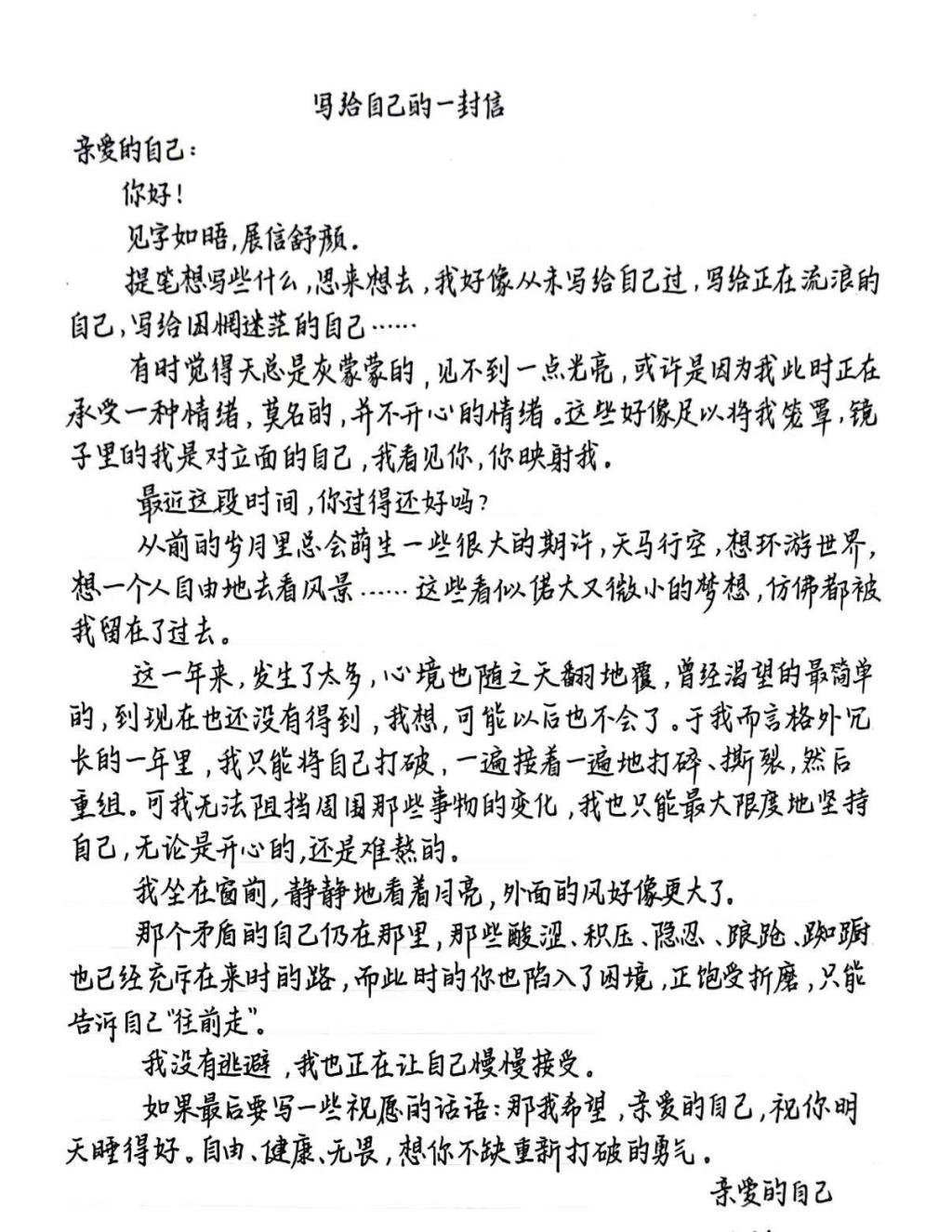 第一封信里,包含着迷茫与自我怀疑时交织的韧性,既有“天总是灰蒙蒙的,见不到一点光亮”的迷茫,也有“步子小点不怕,往前走就行”的自我打气。在面对学业、未来规划等现实压力时,内心拉扯又努力站稳的真实写照。第二封信里有对失控的焦虑和接纳自己的和解“将自己打破、撕裂、重组”的表述,体现了对生活失控感的焦虑。信里“接受命运给你的一切考验”“把一切交给时间”,则是在焦虑中寻求与自我、与现实的和解,是大学生在成长阵痛中逐渐成熟的心理轨迹。