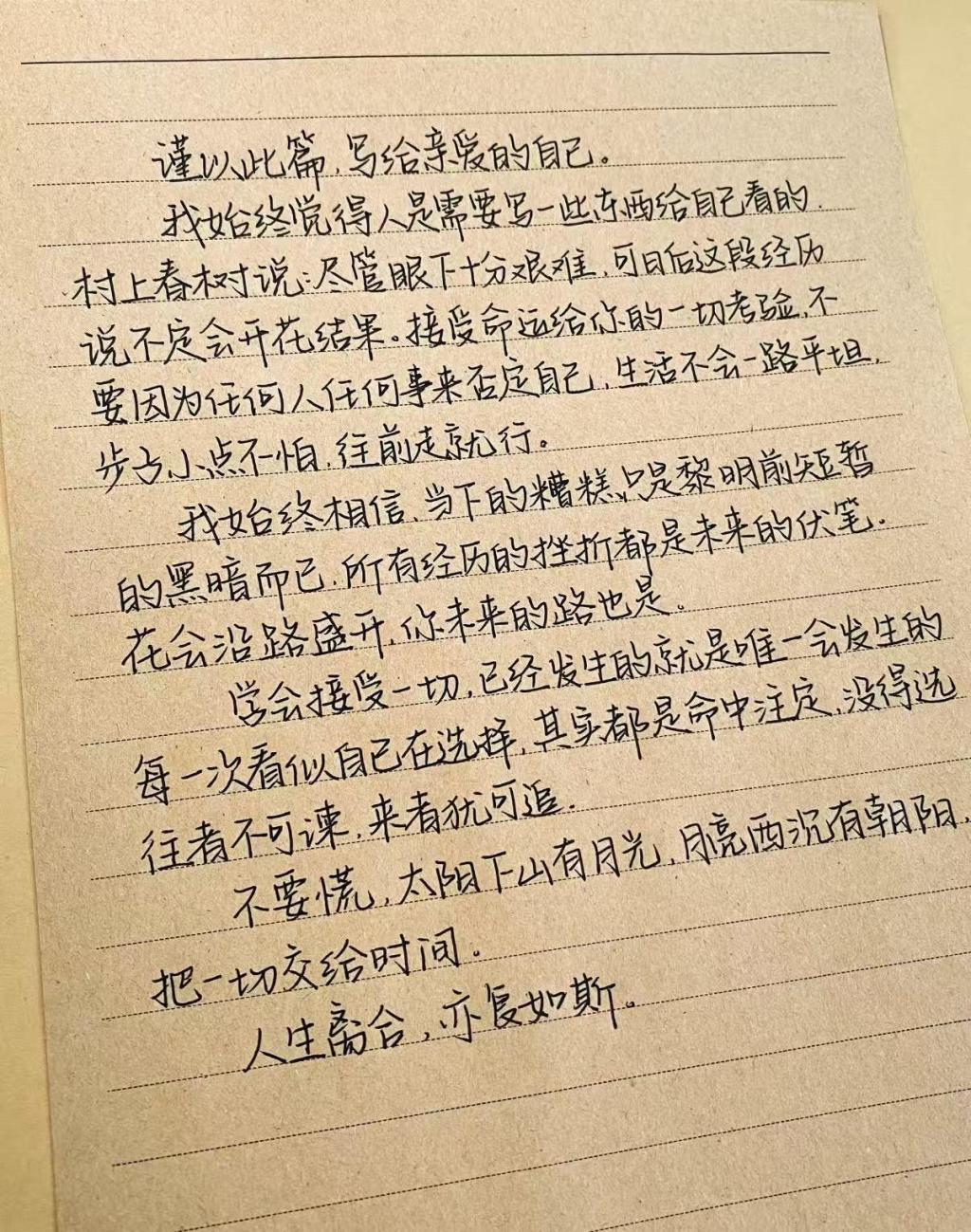 写下期许,是对未来的郑重承诺;回望过往,是为了更好地前行。这些信让学生们更加懂得珍惜当下,也让他们对未来多了几分笃定。这些写给未来自己的信,是青年在迷茫与焦虑中进行的一场自我对话与疗愈:既通过文字梳理了内心积压的情绪,用“往前走”的韧性对抗现实的不确定性,也将对自我的期许与坚守固化为跨越时间的成长契约,最终在从憧憬宏大理想转向关注当下安稳的心态转变中,完成了一次重要的自我确认与精神锚定。