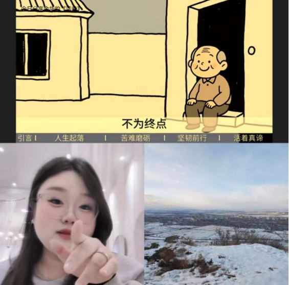 邢莫茜同学以“以美为翼,我的寒假舞蹈拾光”为主题,用灵活鲜明的舞蹈传递青春的自信与灵动;王嘉毅同学通过登山运动以“寒假动起来,解锁我的元气运动”为主题拍摄了家乡冬日的雪景,辽阔的冰雪天地诠释了青春的开阔与坚韧;韩禹桐同学以“书香伴假期,1分钟好书速推”选用《活着》主题的漫画作品,借老人独坐门口的画面,表达对人生起落与生命真谛的思考。
