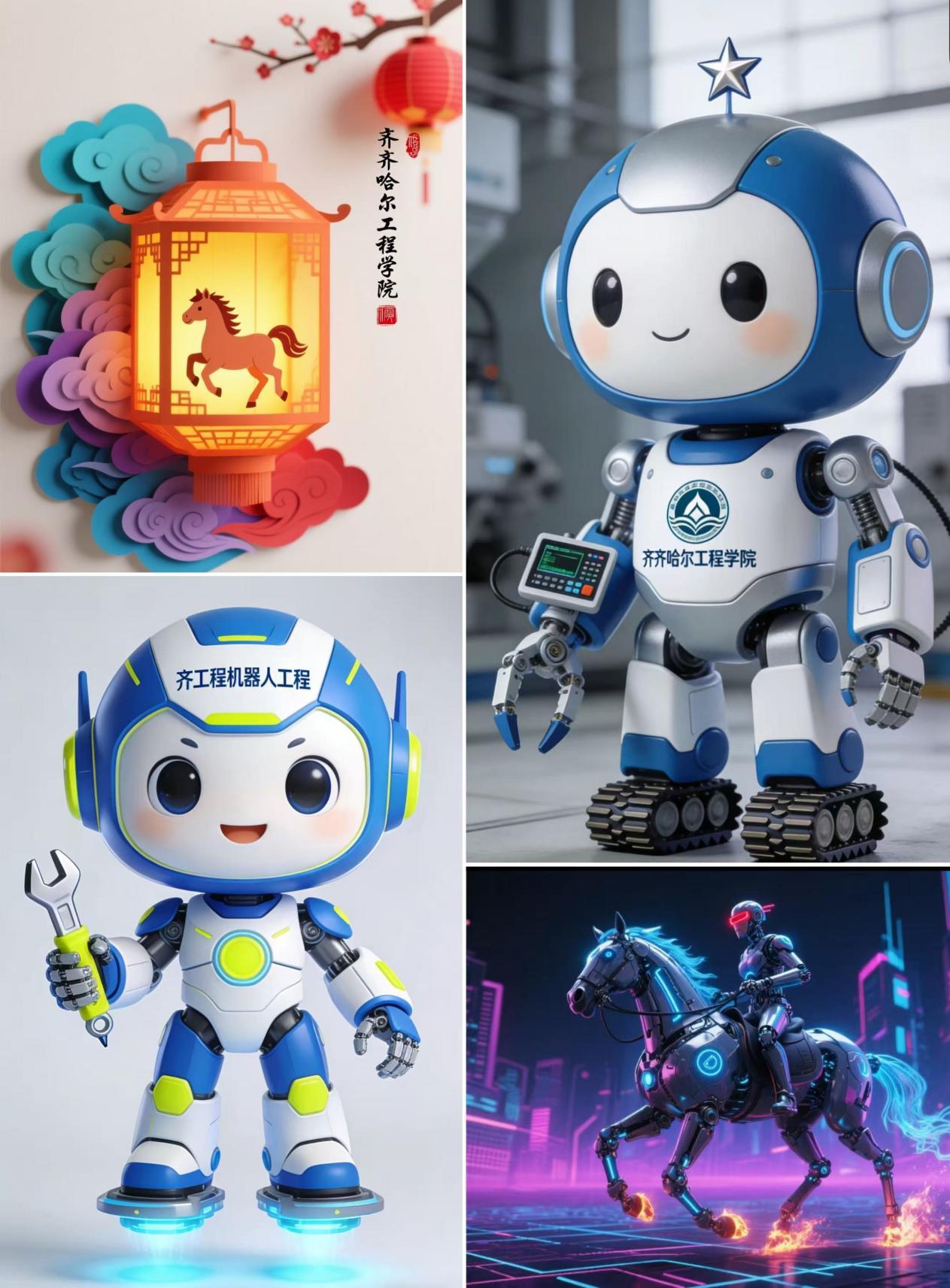 进行过程中,学生们分工明确、思维活跃,设计的符号亲和力与专业感并重。采用圆润的卡通化造型,蓝白荧光黄配色清新明亮,头盔上的"齐工程机器人工程"文字标识明确。扳手工具、机械关节、悬浮脚部等细节强化了工程属性,整体呈现"萌系科技"风格,有的采用剪纸、灯笼、祥云、梅花等传统元素,但通过立体化处理、渐变色彩和现代构图手法,使传统符号呈现新视觉语言。马到成功、喜上眉梢等吉祥寓意明确,但整体风格介于传统与现代之间,既有节日氛围又具设计感。