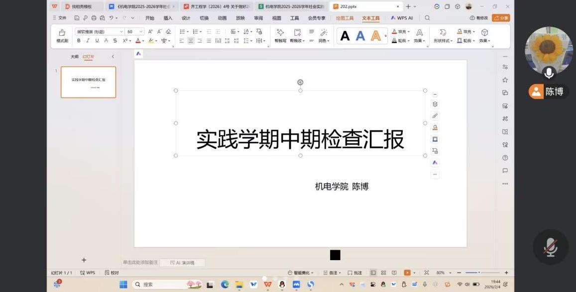 为了学生能够顺利完成社会实践学期的各项任务,2月4日,机电学院教师陈博开展了线上社会实践学期中期检查会。会议由陈博老师主持,全体学生全部参会。