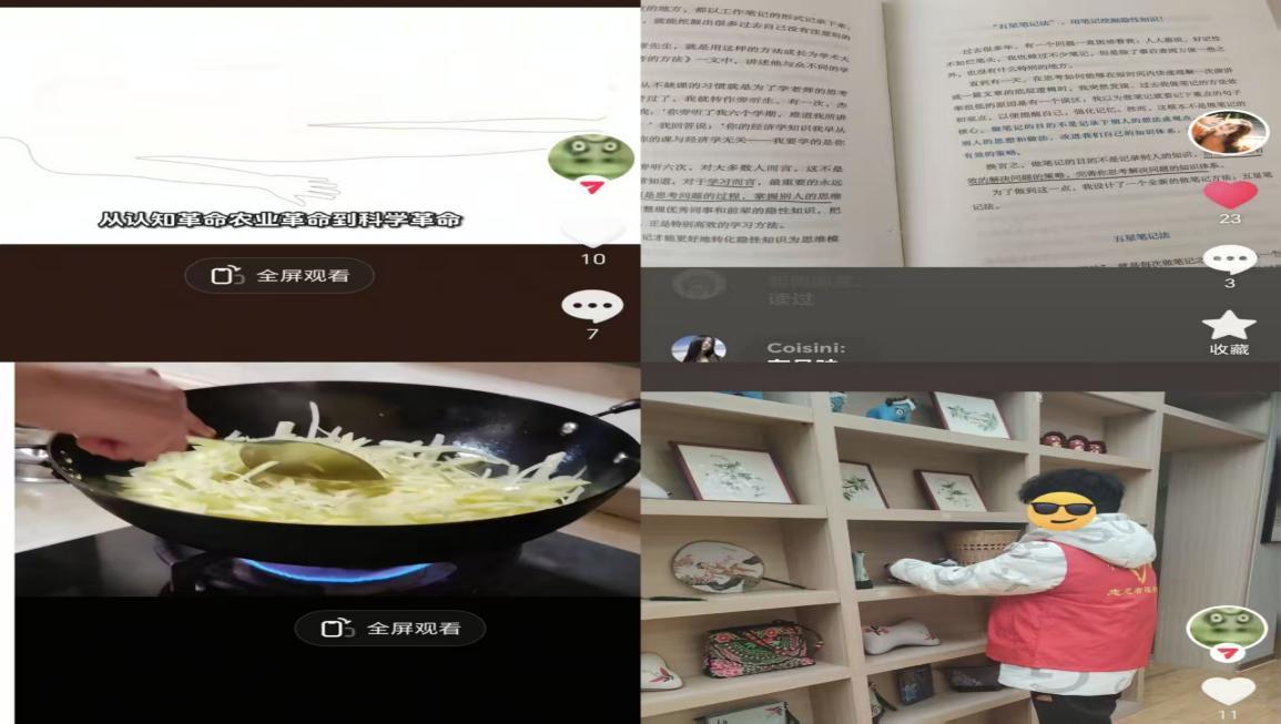参赛作品风格多元、内容鲜活:既有以《人类简史》为蓝本,用动画梳理从认知革命到科学革命演进脉络的知识科普视频,也有分享“五星笔记法”等高效学习技巧的读书感悟;既有记录铁锅炒土豆丝全过程、充满烟火气的美食创作,也有学生们身穿红马甲整理公益书架的温暖志愿服务瞬间。