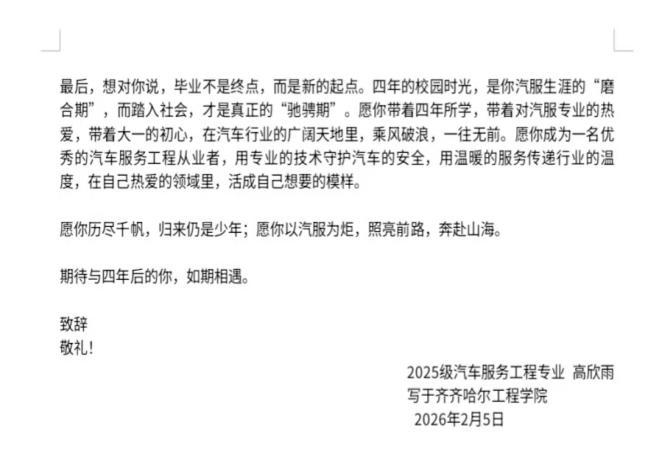 从活动完成质量来看,本次实践成果亮点突出、成效扎实。一方面,内容深度与专业贴合度高。书信围绕汽车服务工程专业核心,紧密结合学习阶段的课程知识,融入了小组在实训课上的实操体验、对新能源汽车运维等专业方向的探索思考,以及对未来四年专业学习、团队协作、行业发展的清晰规划,并非泛泛而谈的抒情,而是将专业认知与成长期许深度绑定,字里行间满是对专业的敬畏与对未来的笃定。另一方面,团队协作高效且成果完整。小组四人分工明确、配合默契:有人负责梳理专业学习脉络,确保内容贴合课程进度;有人聚焦团队协作细节,记录小组共同成长的点滴;有人统筹文字表达,让书信兼具情感温度与逻辑条理;有人负责校对完善,保障内容准确规范。最终形成的书信作品结构完整、语言真挚,既展现了个人对专业的理解,更体现了小组“各司其职、协同共进”的团队精神,完美契合“团队协作解决问题”的职业核心要求。