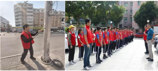 一大早,他们在社区居委会门口集合,领了红马甲、小铲子、扫帚和垃圾袋,就开始分工干活了。一组负责清理社区的电线杆、墙面、垃圾桶甚至路边的护栏上关于租房、招工的小纸条,粘得还挺牢,他们拿着小铲子一点点地刮,刮不掉的就沾点水再擦,不放过任何一个角落。另一组负责清扫街道,把路边的落叶、纸屑、塑料瓶这些垃圾扫成一堆,再装袋运到垃圾桶旁。何杰同学主要负责刮小广告,一开始手法生疏,铲子总刮到墙面,慢慢找到窍门就顺手多了,和伙伴们边干边聊天,原本看着乱糟糟的街道,一点点就变干净了。