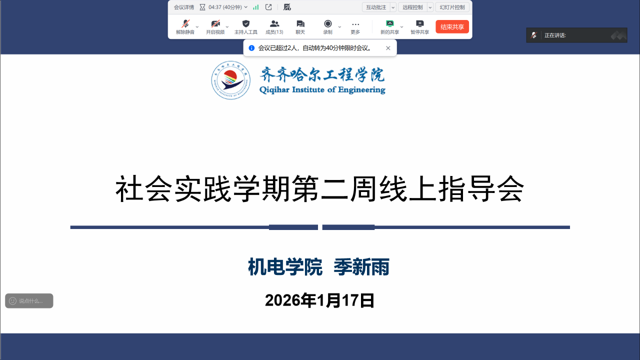 1月17日,季新雨老师以线上形式召开了第二周的社会实践指导会,季新雨老师首先听取了各小组关于本周实践内容、遇到的问题及阶段性成果的汇报。针对同学们提出的实践岗位适配性不足、数据采集困难等问题,季老师逐一进行了细致解答,并结合自身专业经验给出了具体的解决方案和优化建议。她强调,社会实践不仅是将理论知识应用于实际的过程,更是锻炼同学们沟通协作与问题解决能力的重要契机,鼓励大家在遇到困难时主动思考、积极探索。