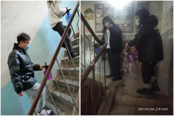 为了人们安全出行和维护小区环境整洁美观,齐齐哈尔工程学院GY-292组初祥瑞、赵鑫、徐天宇、李奕霖,于2021年1月4日在肇东市利用假期时间,进行无偿自发性公益活动帮助社区工作人员进行小区内楼道消毒,共同做好防护病毒的准备。