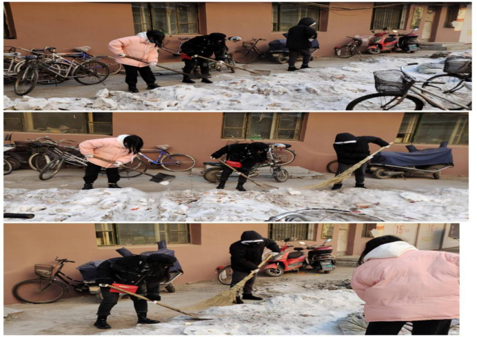 2020年1月13日以来几天的连续大雪使地面上已经积了很厚的雪,大雪积久不融化。小区房屋的雪在上面不融化,下面雪融化的点水结冰使行人踩上去很容易滑倒,而这里是许多老人出门的必经之路,看到许多人小心翼翼地一步一步迈,还不时有人摔倒,齐齐哈尔工程学院GY—399小组四人:于晴、肖剑、张帅、赵雨欣,打算利用中午时间清理积雪。