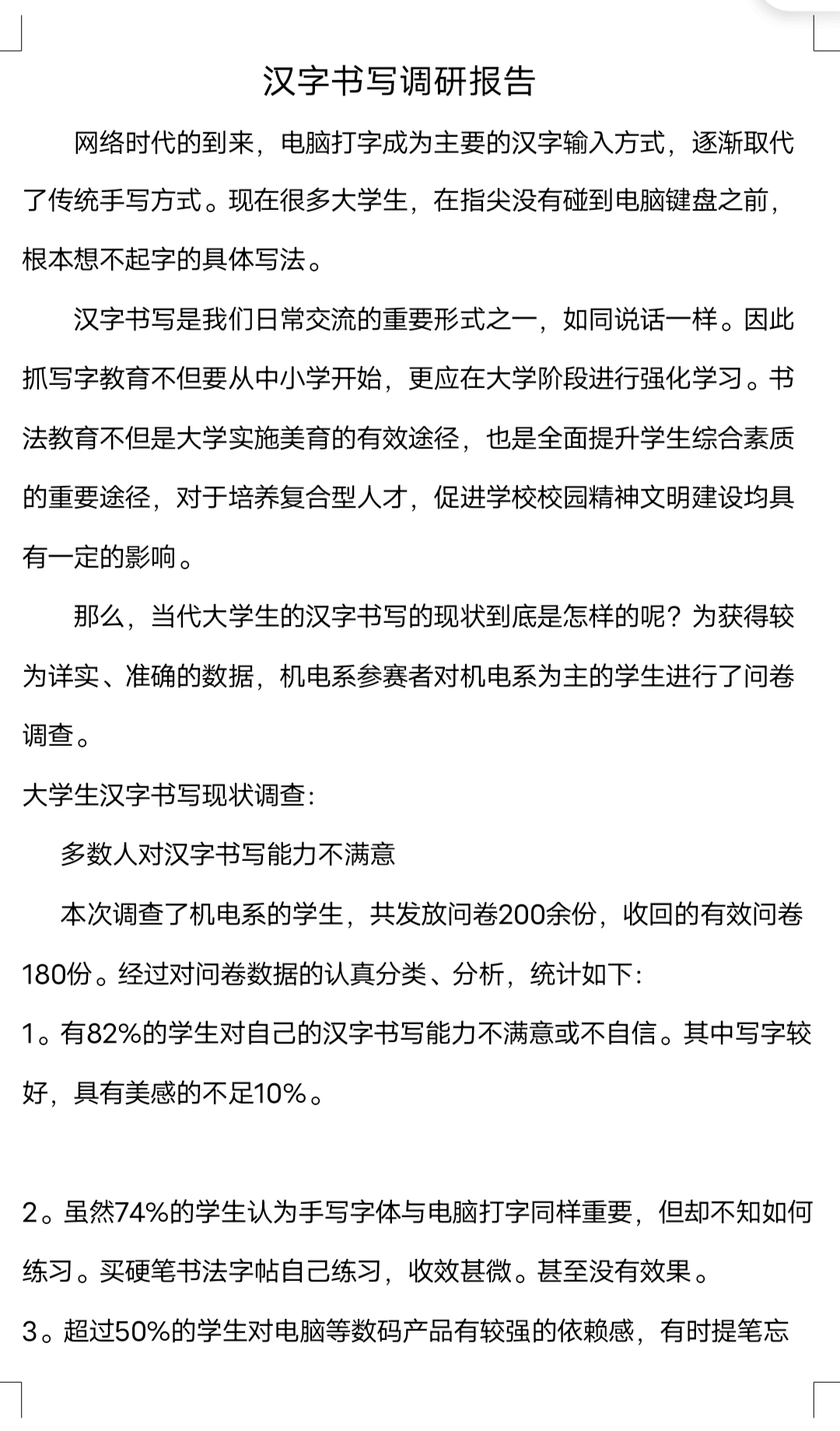参赛者根据自己所制作的调查问卷,得出相关的调研报告。在参赛作品中,有82%的大学生对自己的汉字书写能力不满意或不自信,其中写字较好,具有美感的不足10%。虽然74%的学生认为手写字体与电脑打字同样重要,但却不知如何练习。买硬笔书法字帖自己练习也是收效甚微,甚至没有效果。超过50%的大学生对电脑等数码产品有较强的依赖感,有时提笔忘字,记不清汉字笔画,遇到稍微难写、复杂一点的汉字就写不了,必须靠手机或电脑来帮助。针对以上等问题,同学们在调研报告中提出相关的解决方法,例如:学校应加大对汉字书写重要性的宣传,营造书法教育的氛围;可以通过书法讲座,书法名家进校园,书法竞赛等形式,进一步调动和激发大学生对书法教育的兴趣,开阔学生视野,提高人文素养等。