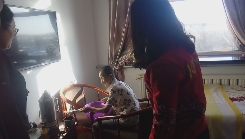 我们在和老人们交谈,这位老人已经97岁了,身体非常硬朗,我们要帮他洗头他不让非得自己洗,每次都是自己洗头,不需要别人。福利院的老人们都很热情好客,给我们讲一些从前的故事,让我们从这些故事中很是感动