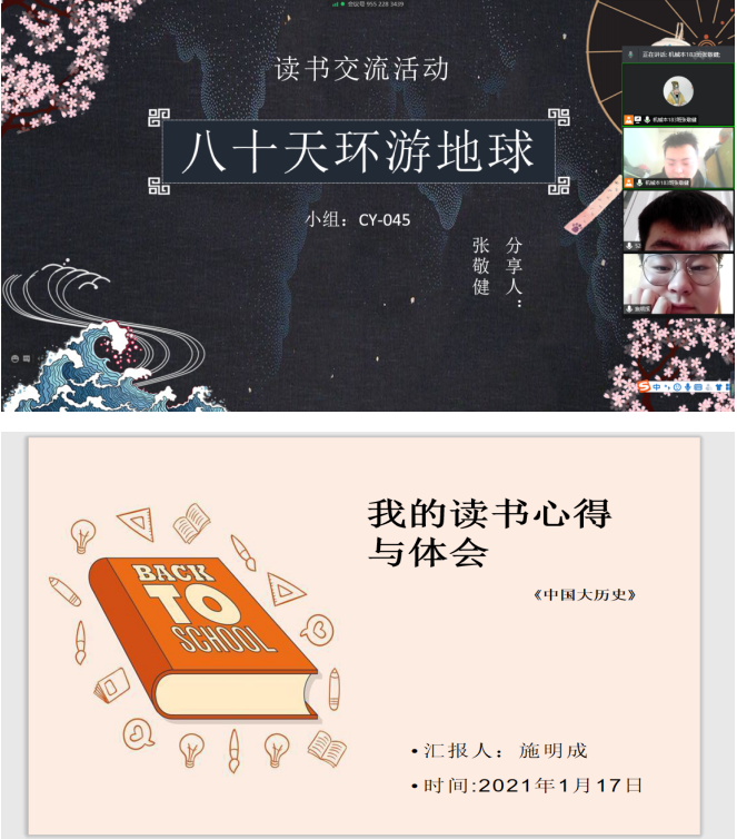 为在假期期间提高小组成员文化素养,1月17日,机械本183班CY-045组组长张敬健同学在腾讯会议开展“浸书香墨韵,绘人生底色”读书交流活动,组员任志坚、施明成参加了此次交流活动。