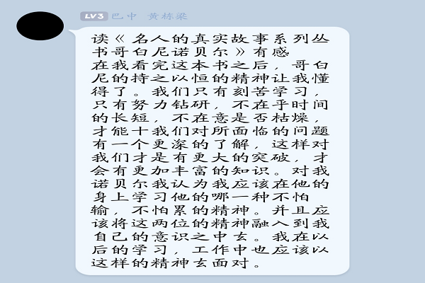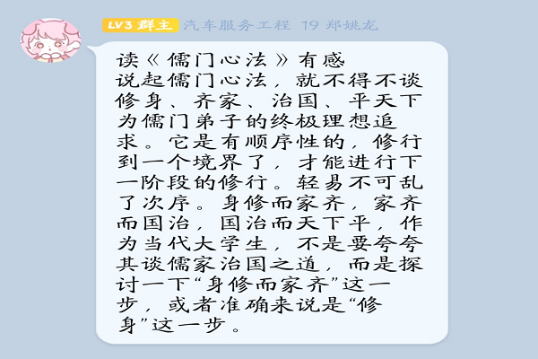 因为疫情管控原因,小组活动改为线上活动,我们组在郑姚龙的带领下进行了线上读书交流活动。我们交流的书分别为《中国古代汉语》《儒门心法》《》。这三本书代表着不同的文化。《中国古代汉语》是讲述中国古代文学的书,了解中国古代文字的魅力,感受中国古代文字变化的魅力。《儒门心法》就是谈修身、齐家、治国、平天下为儒门弟子的终极理想追求。它是有顺序性的,修行到一个境界了,才能进行下一阶段的修行。轻易不可乱了次序。《名人的真实故事系列丛书哥白尼诺贝尔》中说我们只有刻苦学习,只有努力钻研,不在乎时间的长短,不在意是否枯燥,才能十我们对所面临的问题有一个更深的了解,这样对我们才是有更大的突破,才会有更加丰富的知识。