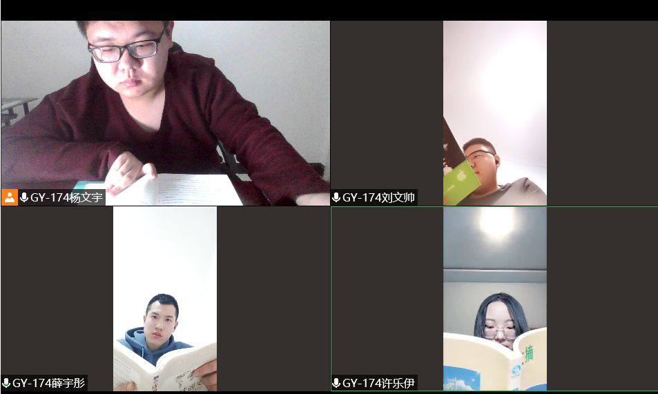在组长杨文宇的安排下,本组成员于2021年1月22日晚在腾讯会议进行小组读书交流活动。在本次活动中,每位同学都分享了自己的阅读经验与阅读经历,介绍了自己的阅读方法,共同解决阅读问题。同时,也将自己所读书目的感受与同学们进行了交流。在本次GY-174小组读书交流会中成员表现积极,分享者精心介绍,聆听着用心倾听并积极互动,活动氛围良好。