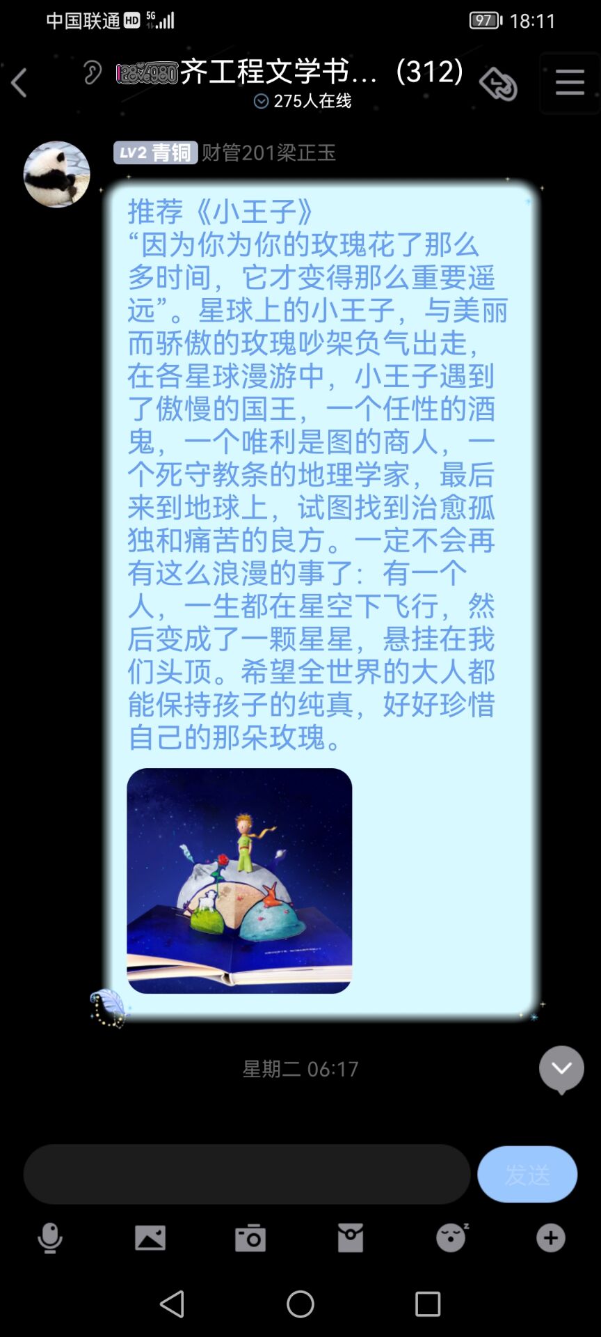 社长杨顺说:“活动由于下暴雪和课程冲突,考虑到同学们的身体改为线上活动,各位同学把自己喜欢的“美”书及理由发在群里参与线上活动”活动开始,同学们在群里发出自己认为的“美”书,并写出理由。