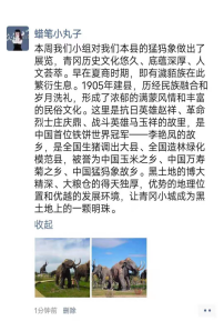 1月19日,我们小组张加政、杜鹏、马加月、王雪通过发布抖音短视频、朋友圈的方式进行了线上宣传家乡猛犸象文化。