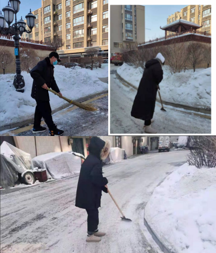助人为乐、无私奉献是我们中华民族的传统美德,而我们作为当代大学生要发扬高尚的人格品质,继承并发扬雷锋精神。由于巴彦县小区被积雪覆盖,导致人们出行很不方便。于是GY-325组组长提议在2021年1月28日在黑龙江省哈尔滨市巴彦县盛隆国际社区开展活动,帮助社区去清理积雪。参加的组员有孙卓、赵亚楠、田超。